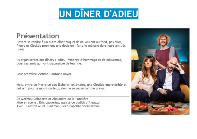 Deux places pour la pièce de théâtre "UN DINER D'ADIEU"  le vendredi 19 Janvier 2024 - 20h30 au Théâtre Jean le Bleu de Manosque est à disposition (https://www.dlva.fr/spectacle/un-diner-dadieu/).